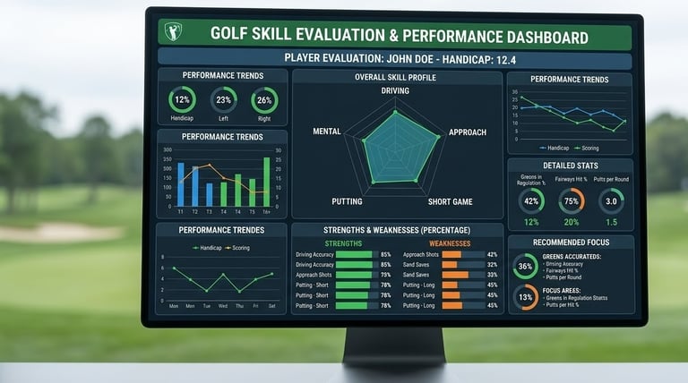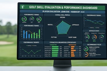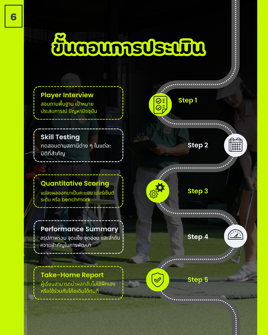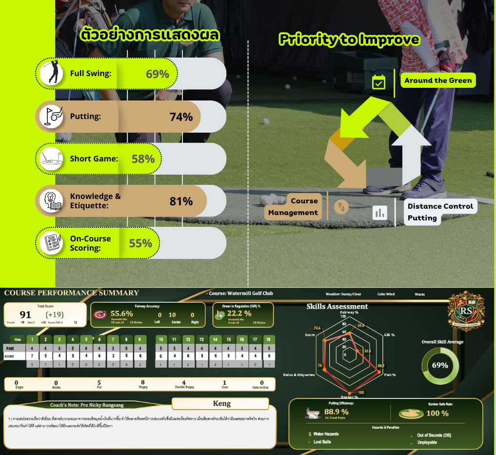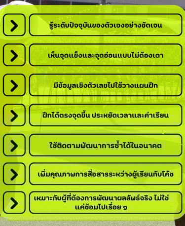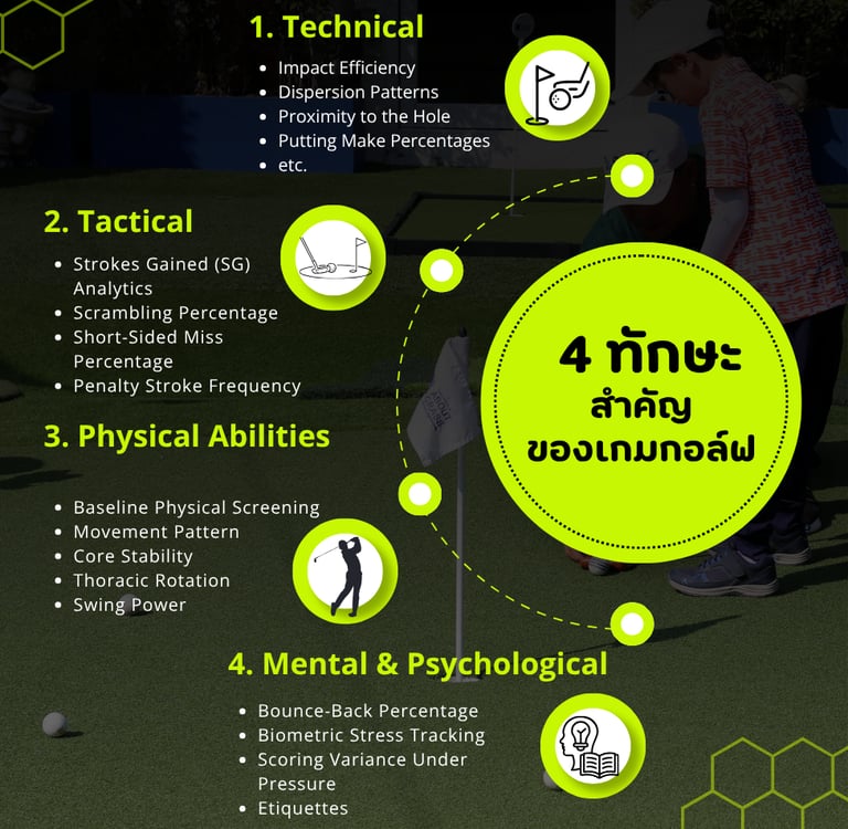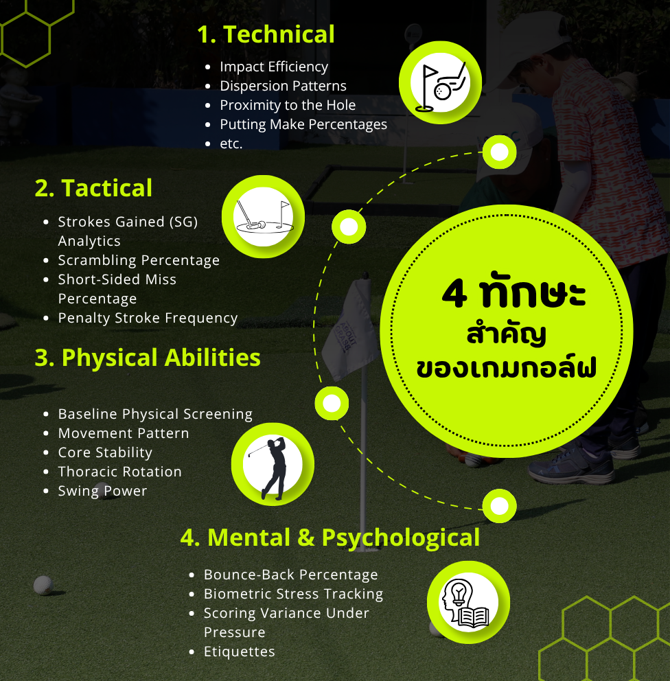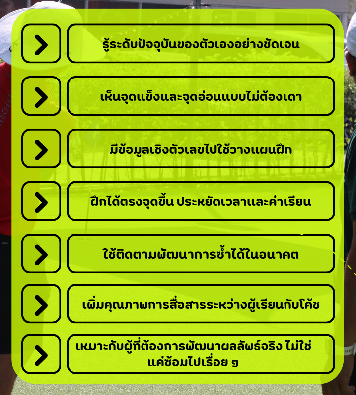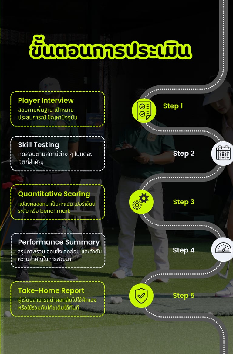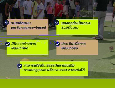 บริการประเมินทักษะกอล์ฟในมิติต่างๆที่จำเป็นต่อการเล่นจริง เพื่อให้นักกอล์ฟเห็นศักยภาพของตนเองอย่างเป็นระบบผ่านผลลัพธ์เชิงตัวเลขเพื่อนำไปใช้พัฒนาต่อได้ทันที